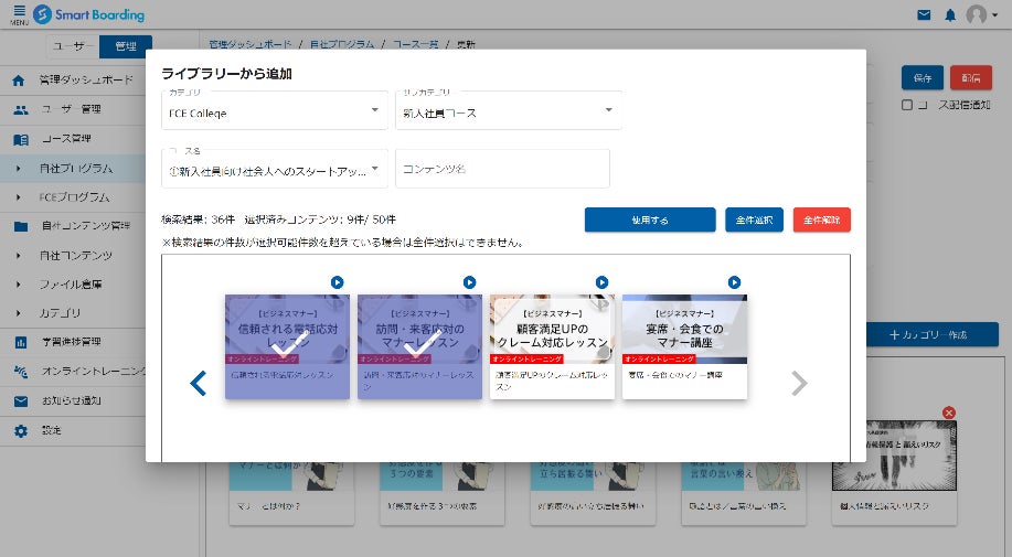 新しいUIでは、Smart Boardingの既存のコンテンツと自社コンテンツを組み合わせて、自社にあった教育プログラムを、さらに直感的な操作で作成いただけるようになりました。