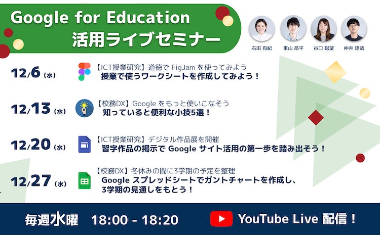 あっという間に12月!学習内容も行事も盛りだくさんな2学期も、まとめの時期に入ろうとしています。12月のセミナーは、3学期に向けた授業や校務でのICTの活用アイデアや、いま大注目の FigJam 活用法、セミナー終了後からすぐに実践できる Google の様々なアプリケーションの便利技まで、充実の内容でお送りします!