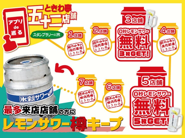 この度、2月1日(火)から2月28日(月)までに「0秒レモンサワー® 仙台ホルモン焼肉酒場 ときわ亭」にご来店いただいたアプリ会員を対象に、アプリ内でスタンプがもらえるキャンペーンを開催いたします。期間内に来店された店舗数に応じて、レモンサワー樽キープ、もしくは0秒レモンサワー飲み放題60分無料券の特典をプレゼントいたします。