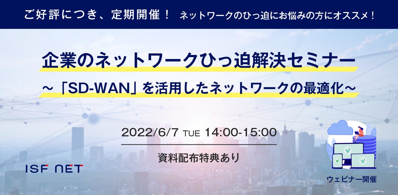ITインフラソリューションを中心に、クラウド環境や、ネットワークシステムの構築・保守・運用におけるサービスを提供する、株式会社アイエスエフネット(本社:東京都港区、代表取締役:渡邉幸義、社員数:2,328名)は、2022年6月7日(火)の日程にて、企業のネットワークひっ迫解決セミナーをオンライン開催いたします。
