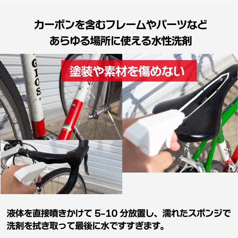 カーボンを含むフレームやパーツなどあらゆる場所に使える自転車用水性洗剤です。