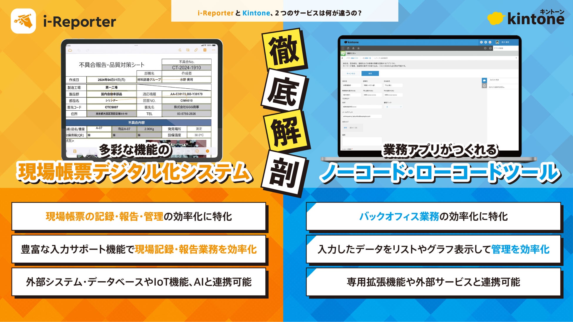 現場帳票をデジタル化する「i-Reporter」と業務アプリをノーコードで作成できる「kintone」、2つは一見同じようなサービスだと思われがちなのですが、得意な領域や役割が異なる上、実は連携サービスです。