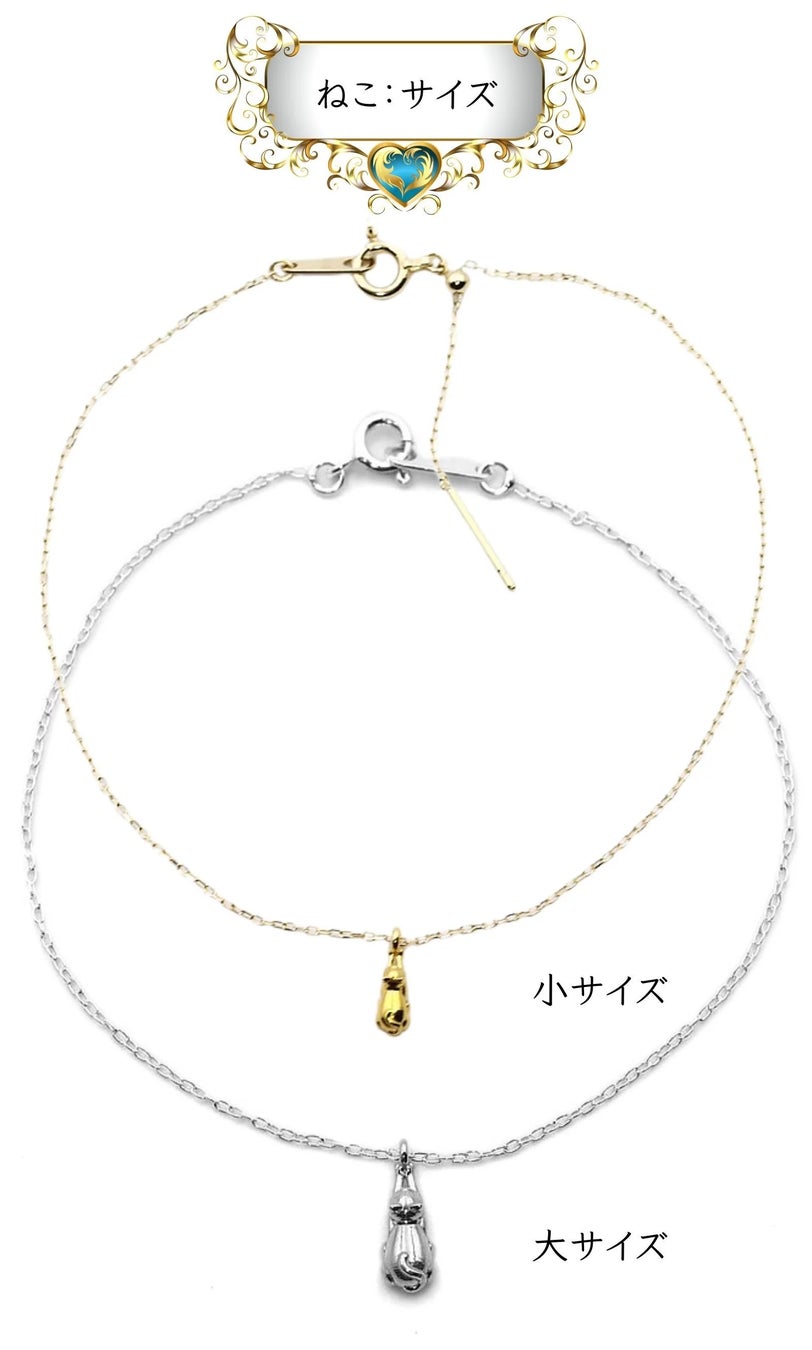 純金のねこに、チェーンは7種類から選べます。ねこのサイズは大サイズと小サイズの2種類です。