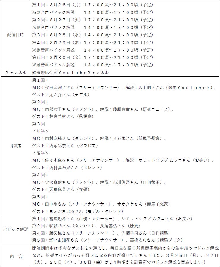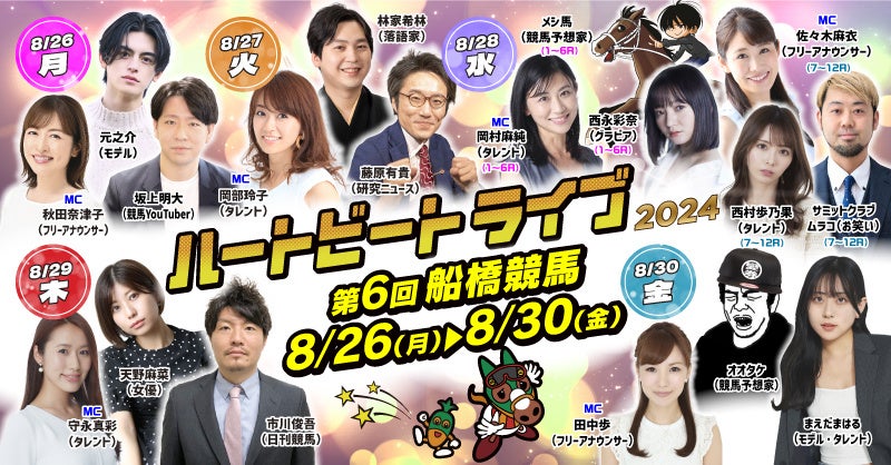 船橋ケイバでは、令和6年度第6回開催を8月26日(月)~8月30日(金)に開催いたします。第6回は「フリオーソレジェンドカップ(SⅢ)」の開催に加え、「レディースウェルカムデー」や「キャロッタグリーティング」など、女性やお子様も楽しめるイベントを実施いたします!夏の終わりも船橋ケイバを楽しみましょう!