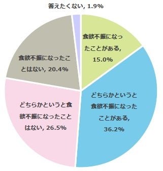 暑さが原因で食欲不振になったことがあるか質問したところ、51.2%が「食欲不振になったことがある」(食欲不振になったことがある:15.0%、どちらかというと食欲不振になったことがある:36.2%)と回答しました。