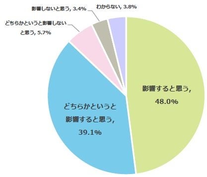 夏季期間中の子どものマスク着用は熱中症に影響すると思うか質問したところ、87.1%が「影響すると思う」(影響すると思う:48.0%、どちらかというと影響すると思う:39.1%)と、多くの保護者が夏季期間中の子どものマスク着用に対して、熱中症のリスクを感じていることがわかりました。