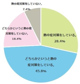 夏季期間中、熱中症対策をしているか質問したところ、74.2%が「熱中症対策をしている」(熱中症対策をしている:28.4%、どちらかというと熱中症対策をしている:45.8%)と回答しました。