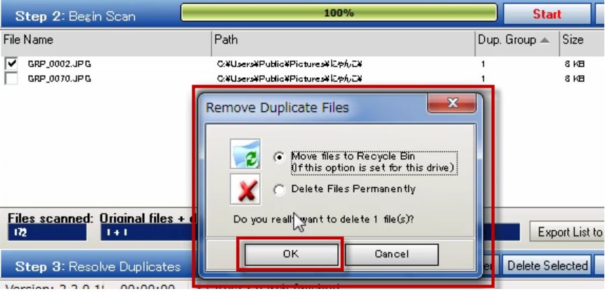 Step2:検索結果が表示されるので必要に応じてプレビューし、不要な場合は「Delete Selected」をクリックします。続いて、ゴミ箱に移動するかどうか確認するメッセージが出ますので、完全に削除する場合は「Delete Files Permanently」にチェックを入れて「OK」を押します。