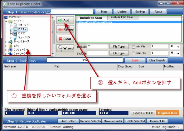Step1:重複を探すフォルダを選び、「Add」をクリックし、「File Type」からファイルの種類を指定して「Start」を押します。