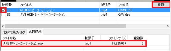 Step2:比較が完了すると「比較結果」の上側に重複動画が表示されるので、不要な動画にチェックを入れて「削除」をクリックします。