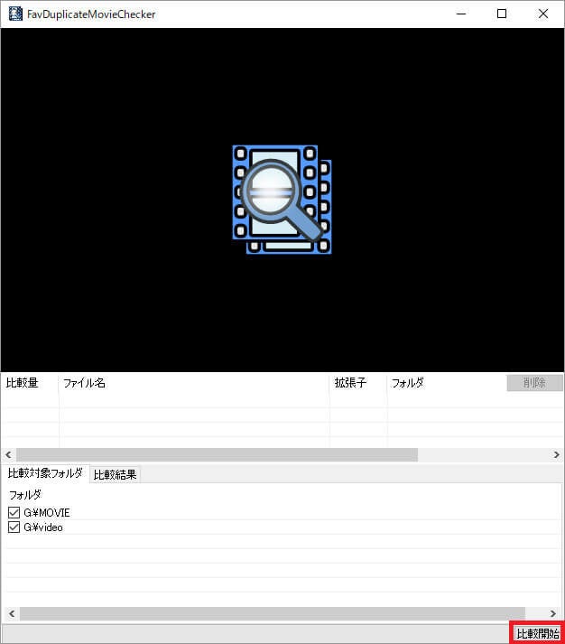 Step1:比較する動画が入っているフォルダを画面下側の「比較対象フォルダ」にドラッグ&ドロップした後、画面右下の「比較開始」をクリックします。