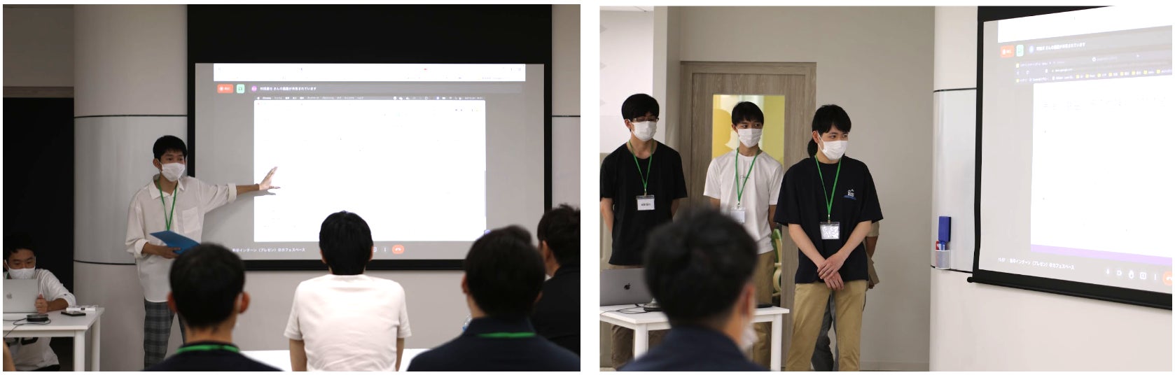 最終日はチームごとにプレゼンテーションを行いました。代表取締役CEO 和田、執行役員CTO 永田、執行役員CPO 石田の3名が審査員として参加し、様々な角度からフィードバックを行いました。