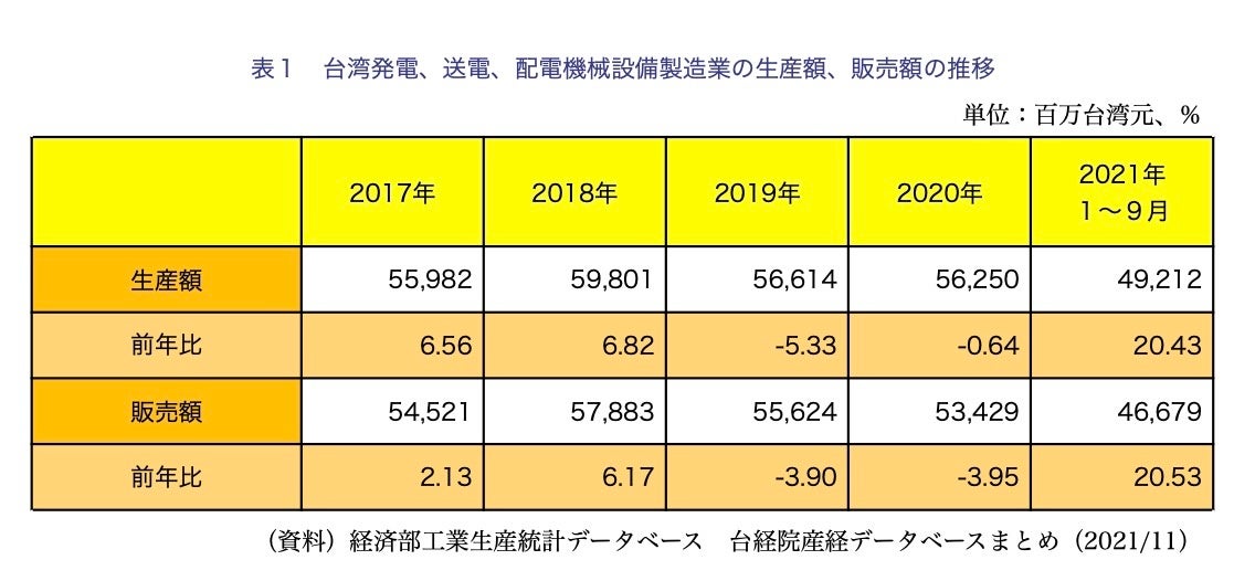 また、製造業の工場建設・拡張による需要増加を受けて、21年1〜9月のブレーカーおよび配電盤の生産額と販売額はいずれも同10%以上成長した。総合すると、21年1〜9月の台湾発電・送電・配電機械製造業の生産額は同20.43%増の492億1,200万台湾元、販売額は同20.53%増の466億7,900万台湾元となった。