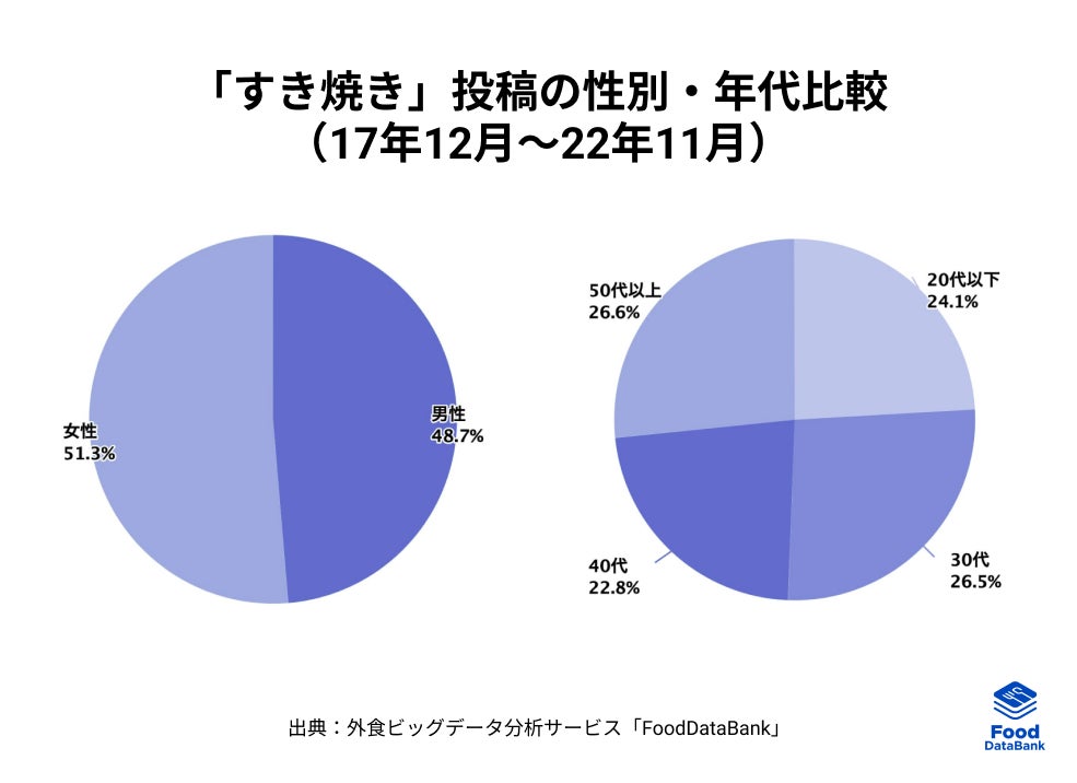 性別や年代に注目すると、男女はほぼ半数ずつ、年代もすべての世代でほぼ均等に分かれていました。すき焼きは、性別や年代を問わず多くの方に好まれるメニューだと言うことがわかります。