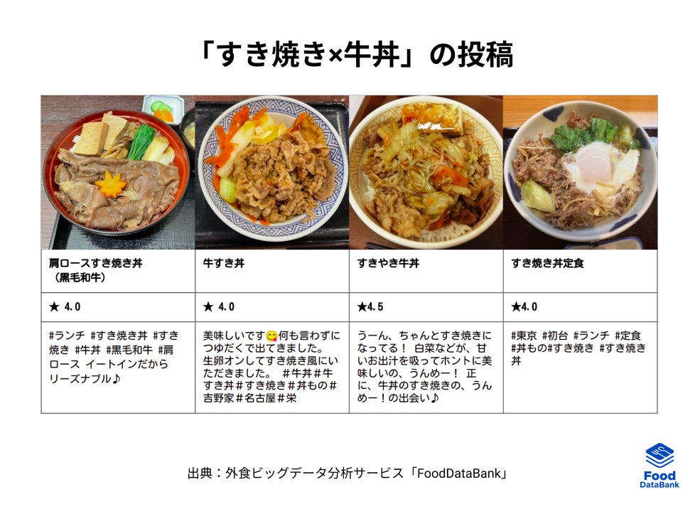 「すき焼き」は牛肉をメインにいただく料理であることから、一般的な家庭料理と比べて高価なメニューとして扱われやすいですが、"いつもの牛丼をすき焼き丼に変えてプチ贅沢感を満たす"、ランチにすることでディナーよりは価格を抑えて"自分へのご褒美"にするといった需要があるようです。