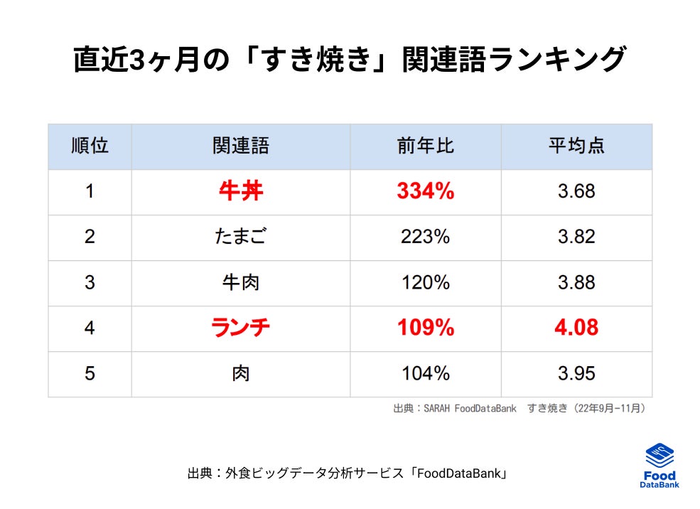 直近3ヶ月のすき焼きに関するキーワードランキングでは「牛丼」が前年比334%と伸長しています。ファストフードの代表格である牛丼チェーン各社から発売されている「すき焼き丼」が多く食べられている傾向にあるようです。