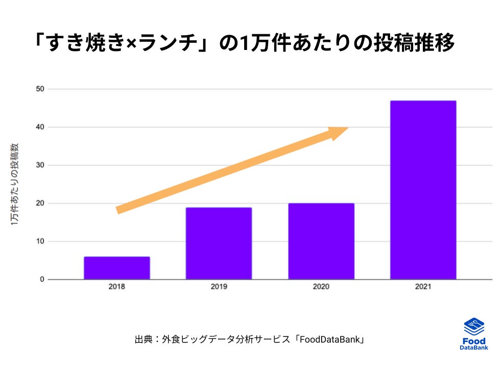 また、「すき焼き×ランチ」の年毎の1万件あたりの投稿推移を見てみると、全体的に右肩上がりに伸長していることが分かりました。