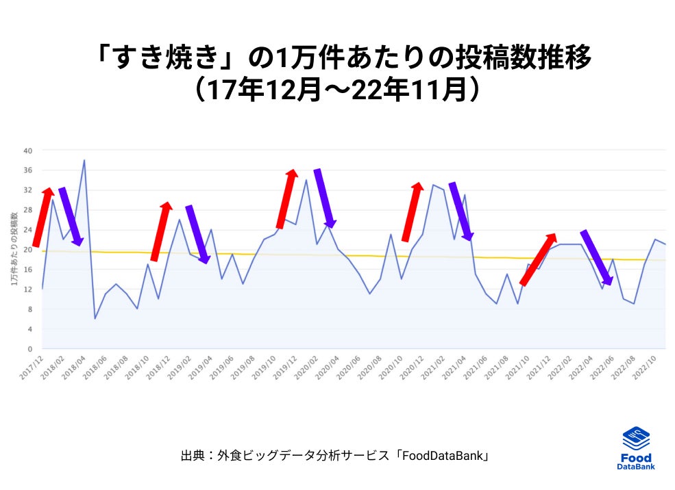 外食ビッグデータ分析サービス「FoodDataBank」から「すき焼き」の1万件あたりの投稿推移を見てみると、すき焼きは毎年12月〜1月の年末年始に伸長していることが分かりました。また、新学期・新年度がスタートする4月や、お盆休みに家族が集まる8月にも伸びが見られ、ハレの日メニュー(ハレ飯)として選ばれる傾向があるようです。