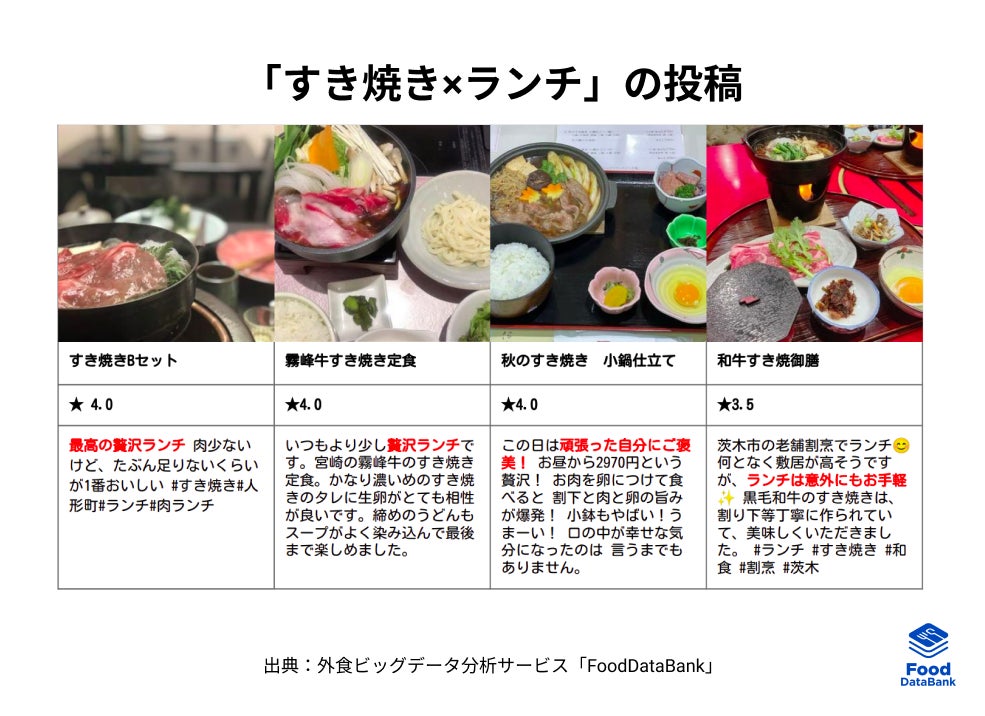 レビューに注目すると、「じぶんへのご褒美」や「贅沢ランチ」としてすき焼きが選ばれていたり、「ランチ」にすることで贅沢ごはんをディナーよりリーズナブルに食べることができる、という意識が見て取れます。