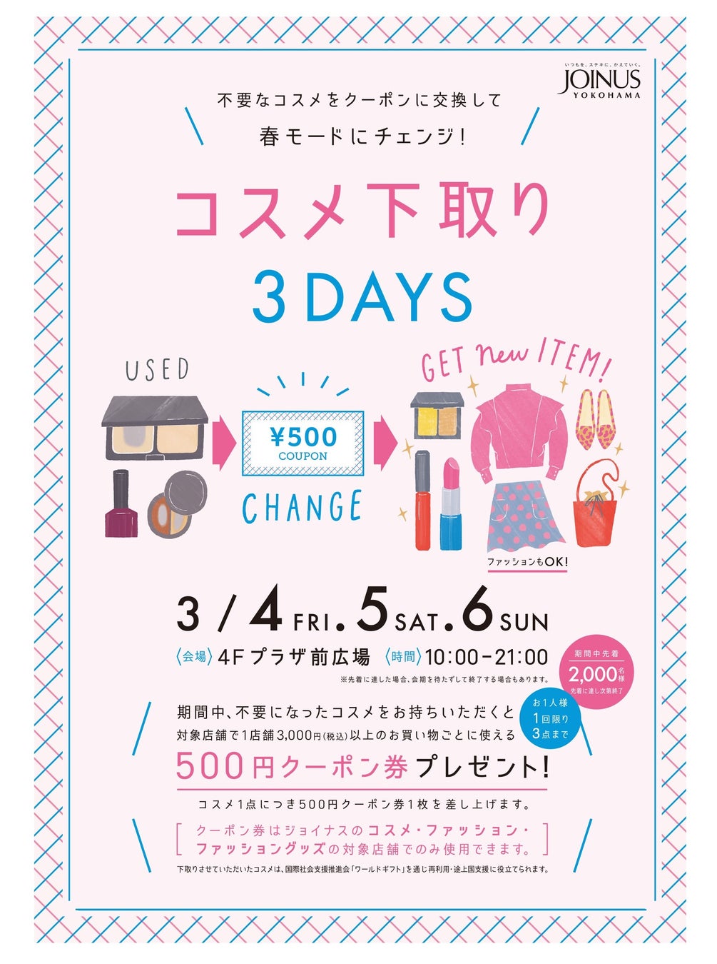 相鉄グループの㈱相鉄ビルマネジメント(本社・横浜市西区、社長・森村幹夫)が運営するジョイナスでは、持続可能な開発目標「SDGs」への取り組みを強化しています。その一環として、2022年3月4日(金)~3月6日(日)までの期間中、不要になったコスメをお持ちいただくと1点につき500円クーポン券に交換ができる、コスメ下取りキャンペーンを実施します。