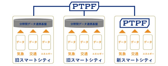 各都市、各分野でバラバラにスマートシティ化に向けて進んでいたデータ活用でしたが、IoTデータにPTPF™プロトコルというブロックチェーンを活用した共通言語を持たせることでIoTデータの取引が可能となり、開発コストをかけることなくあらゆる分野や都市で横断したデータの活用が容易にできます。