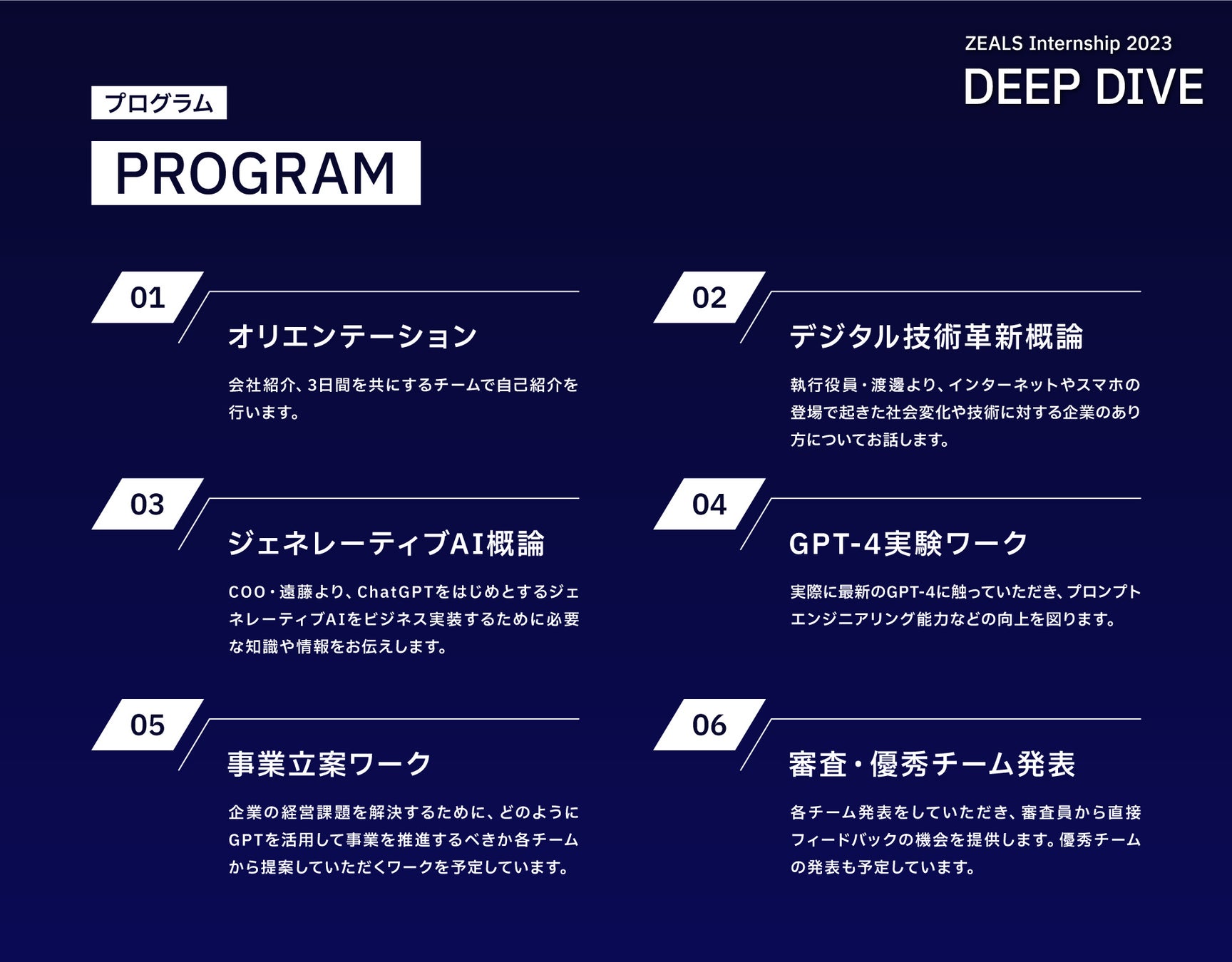 今夏、ジールスではデジタル技術の変遷とジェネレーティブAIを学び、GPT-4を活用した実践ワークを通して、企業の経営課題を解決するための事業立案を行う「3Daysインターンシップ」を開催します。