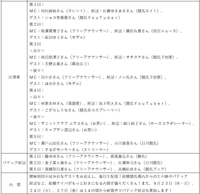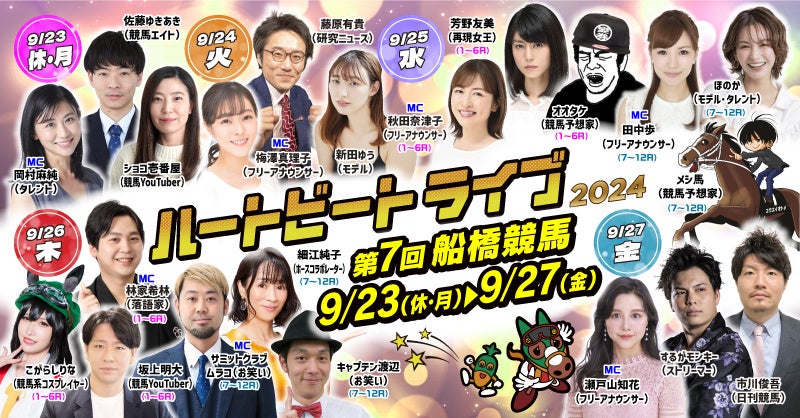 船橋ケイバでは、令和6年度第7回開催を9月23日(休・月)~9月27日(金)に開催いたします。今開催は、「日本テレビ盃(JpnⅡ)」と「マリーンカップ(JpnⅢ)」が連日開催!2夜連続の“Road to JBC”をお楽しみください。また、場内では抽選会やBAYFMとコラボした「船橋ケイバ ビギナーズセミナー」など競馬ビギナーも楽しめるイベントを実施いたします。熱戦が続く9月の船橋ケイバを楽しみましょう!