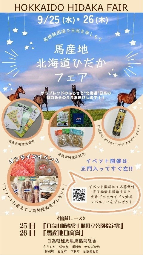 また、オンラインイベントとして、アンケートにご協力いただいた方に抽選で 日高地方の特産品をプレゼント!ポスターにあるQRコード、 または下記URLからご応募ください。 さらに、イベントブースにてアンケート応募受付完了画面を提示すると、 先着でホッカイドウ競馬のノベルティをプレゼント!!