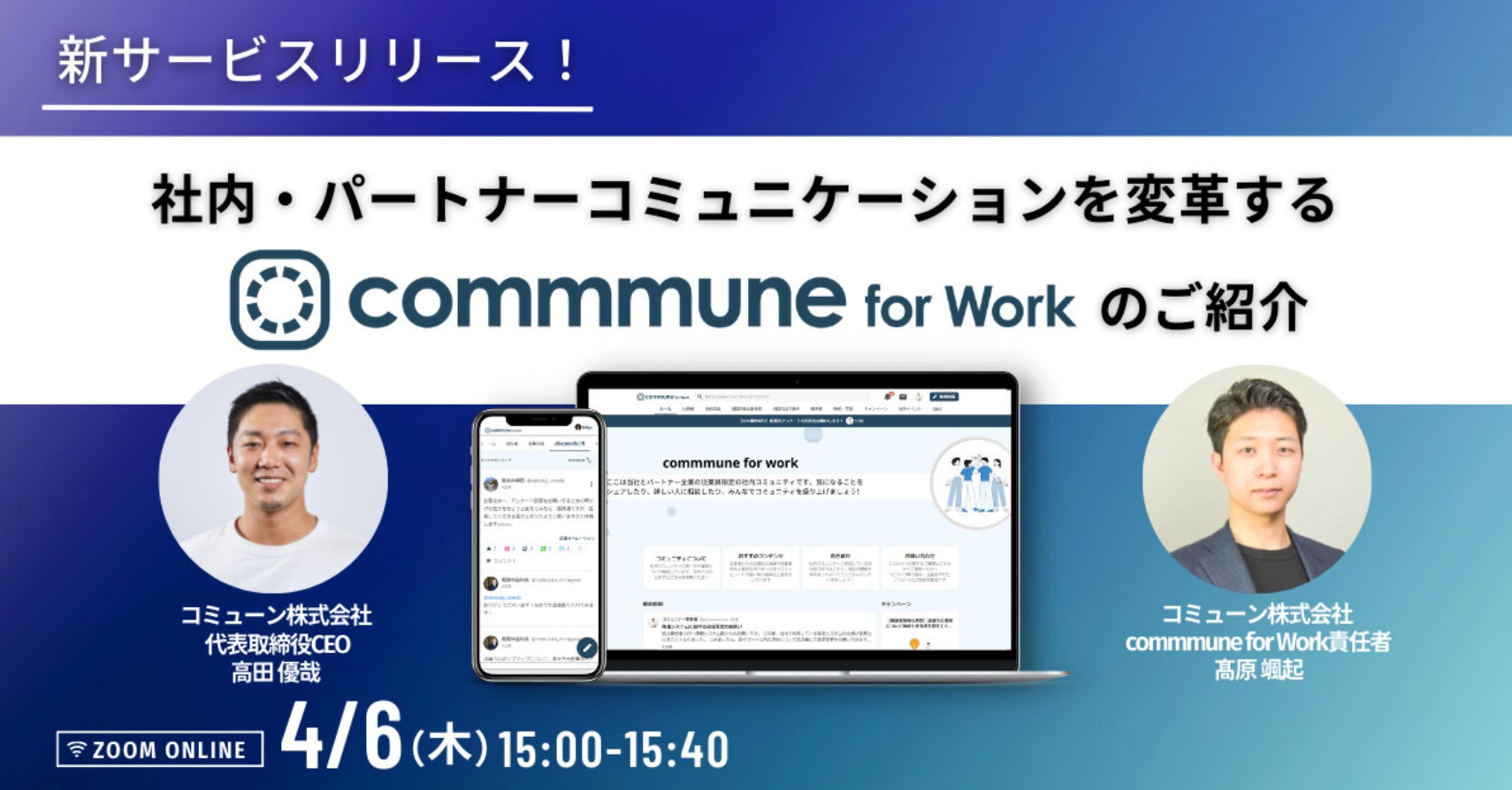 4月6日(木)にcommmune for Workをご紹介するオンラインセミナーも開催しますので、ご興味のある方はぜひお申し込みください。CEOの高田とcommmune for Work責任者の髙原が登壇します。