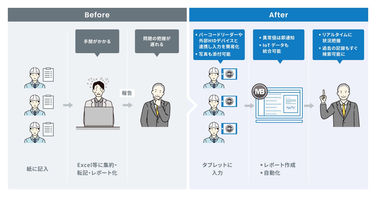 「Data-Jig」は、とてもシンプルな入力フォームをノンプログラミングで実装できるため、現場部門によりタブレットでフォーム作成・入力することができ、オフラインでも動作可能なため、ネットワークが不安定な環境でもご利用いただけます。入力されたデータは、リアルタイムに「MotionBoard」で可視化され、現場と本社・管理部門間のスムーズなデータ連携が実現できます。