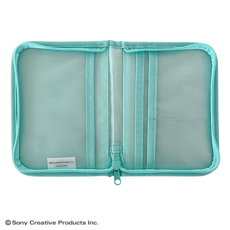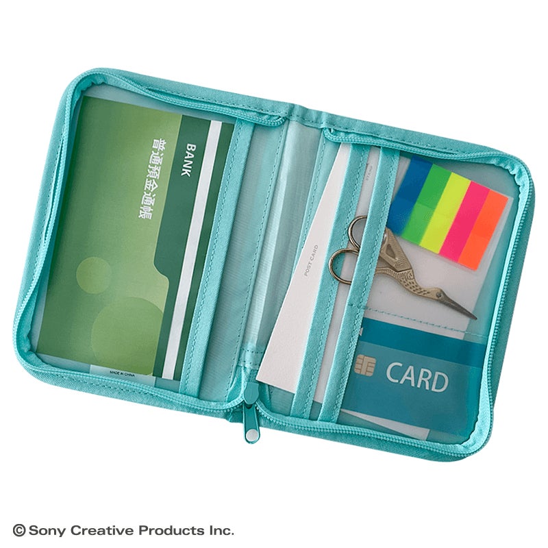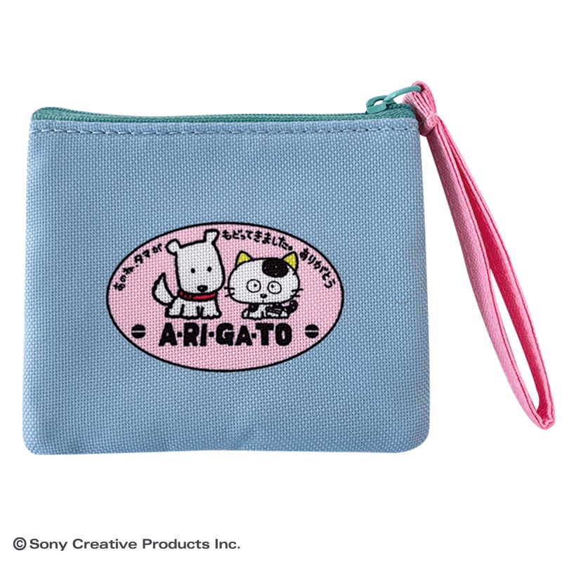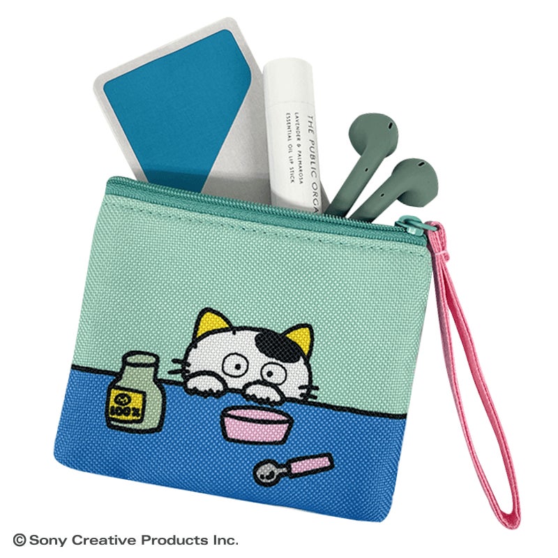 通帳やカード、小物などが入れられるファスナー付きのマルチケースです。表は、昔なつかしい「うちのタマ知りませんか?」のポスターを仲間たちが眺めているデザインです。