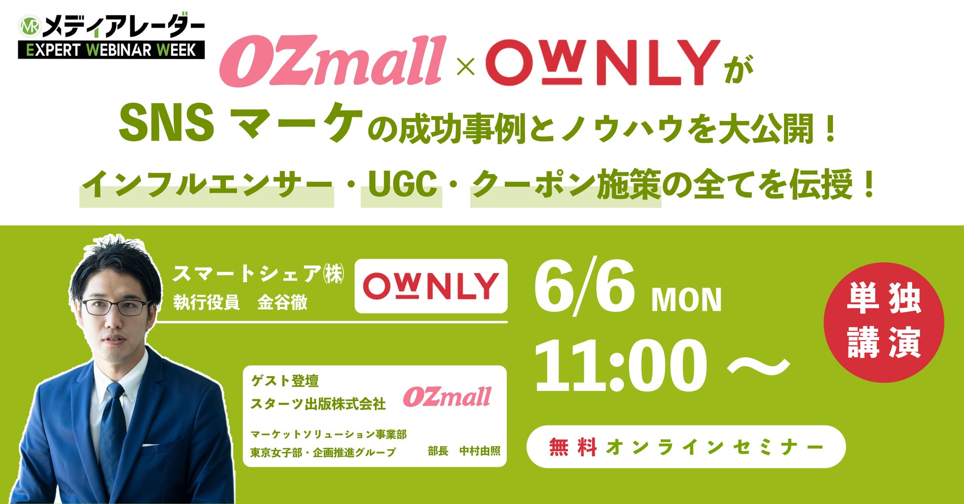 - 「OZmall×OWNLYがSNSマーケの成功事例とノウハウを大公開!インフルエンサー・UGC・クーポン施策の全てを伝授!」6月6日(月)11:00~