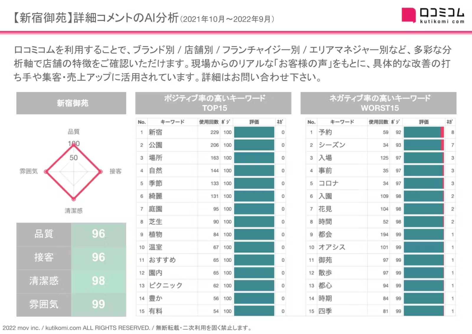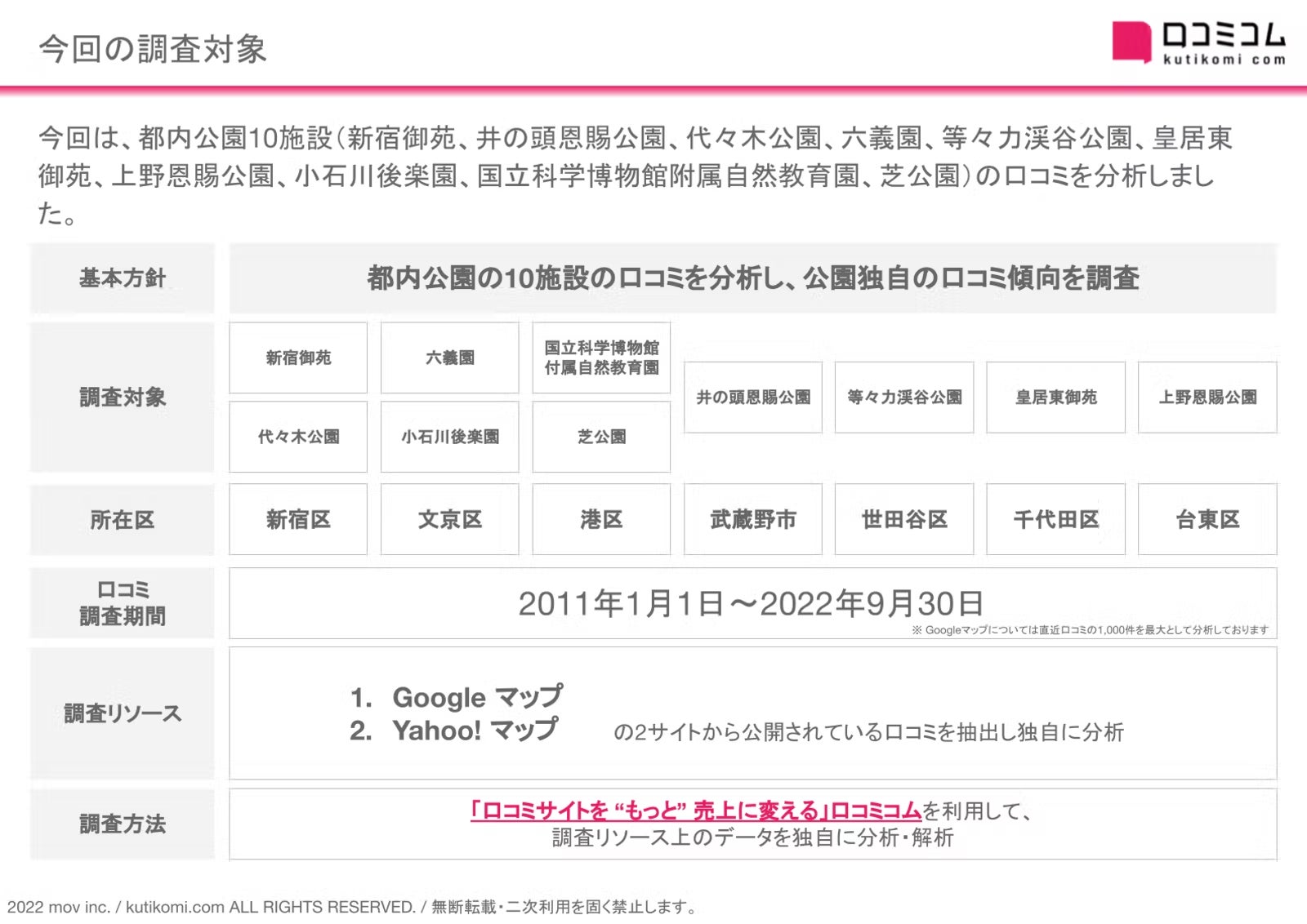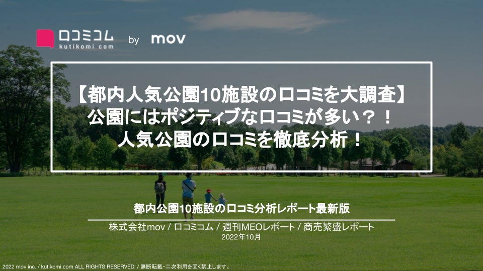 口コミサイトを”もっと”売上に変える店舗支援SaaS「口コミコム」を運営する株式会社mov(代表取締役:渡邊 誠、本社:東京都渋谷区、以下mov)では、『口コミコム』の分析機能を用いてレポートを作成しています。今回は新宿御苑や代々木公園、井の頭恩賜公園など、都内公園10施設の口コミを分析しました。