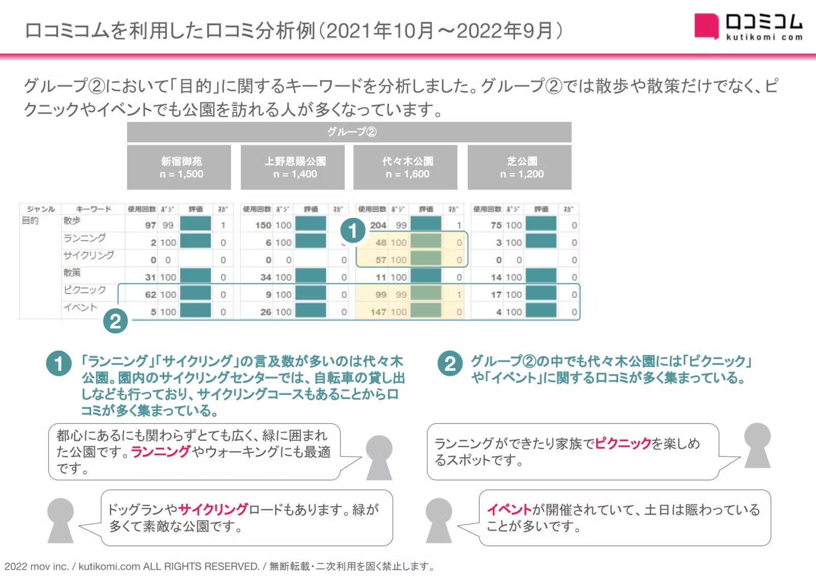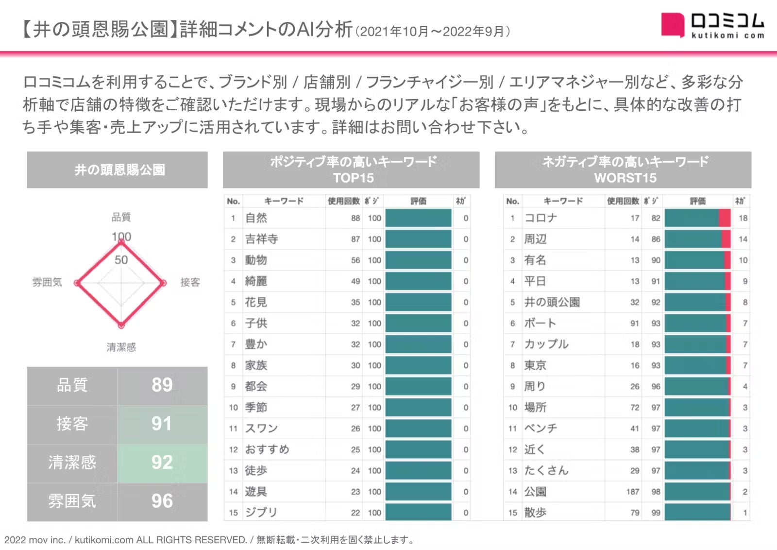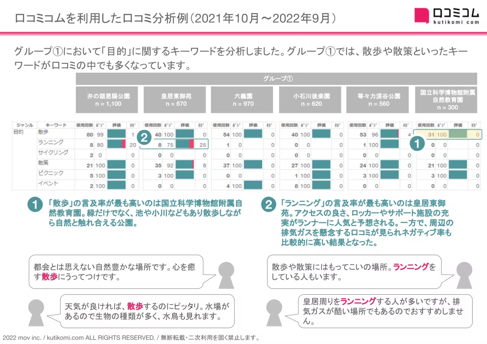 口コミサイトを”もっと”売上に変える店舗支援SaaS「口コミコム」を運営する株式会社mov(代表取締役:渡邊 誠、本社:東京都渋谷区、以下mov)では、『口コミコム』の分析機能を用いてレポートを作成しています。今回は新宿御苑や代々木公園、井の頭恩賜公園など、都内公園10施設の口コミを分析しました。