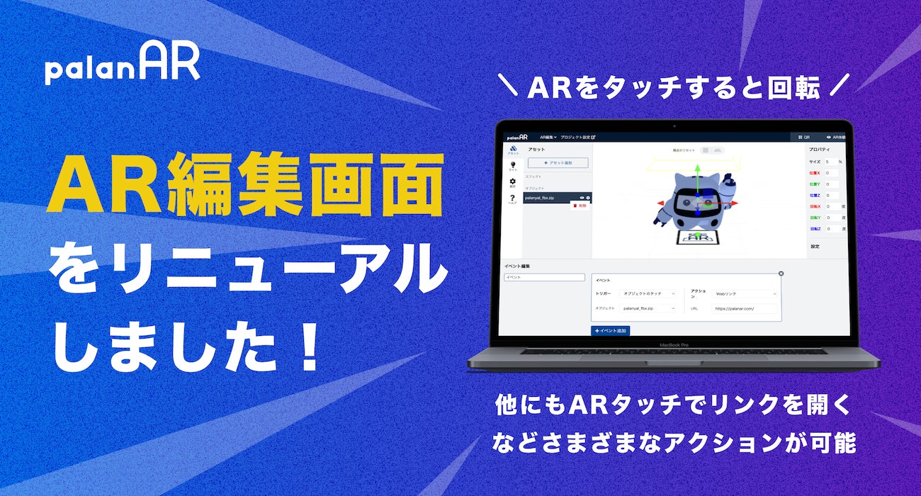 ARシステムを提供する株式会社palan (本社:東京都渋谷区、代表取締役:齋藤 瑛史)は、誰でも簡単にノーコードでARが作成できるサービス「palanAR(パラナル)」において、AR作成機能をリニューアルしました。