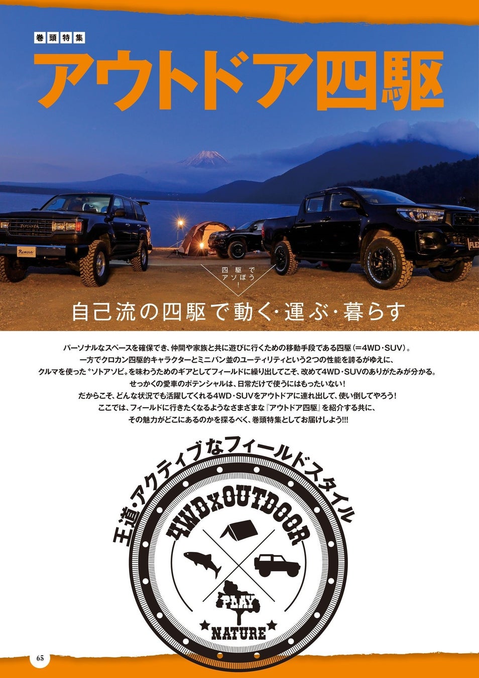 どんな状況にも対応し、タフに、そして飛び切り頼もしく活躍してくれる4WD・SUVをアウトドアで使い倒すためのアイデアと最新スタイルをたっぷりとお届けします!!
