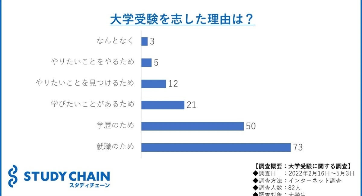 大学受験コーチング『スタディチェーン』( https://studychain.jp/ )の公式ブログ「スタディチェーン ブログ」編集部は、大学生を対象に大学を志した理由についての調査を行いました。