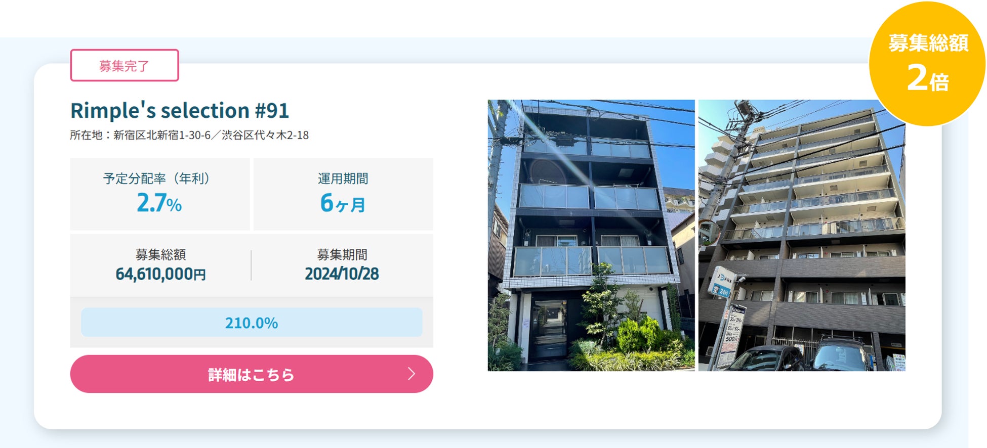 プロパティエージェントの展開する不動産クラウドファンディングRimple’s Selection#91募集総額210%の1.35億円の応募