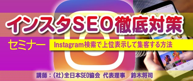 一般社団法人全日本SEO協会(本部:東京都港区、代表理事:鈴木将司)は、検索で“上位表示する方法”を分かりやすく解説する『インスタSEO徹底対策』セミナーを、2023年3月24日(金)東京丸の内、3月8日(水)に大阪梅田、Zoom(オンライン)、3月10日(金)に愛知県産業労働センター ウインクあいち、3月17日(金)に福岡県中小企業振興センターで開催いたします。