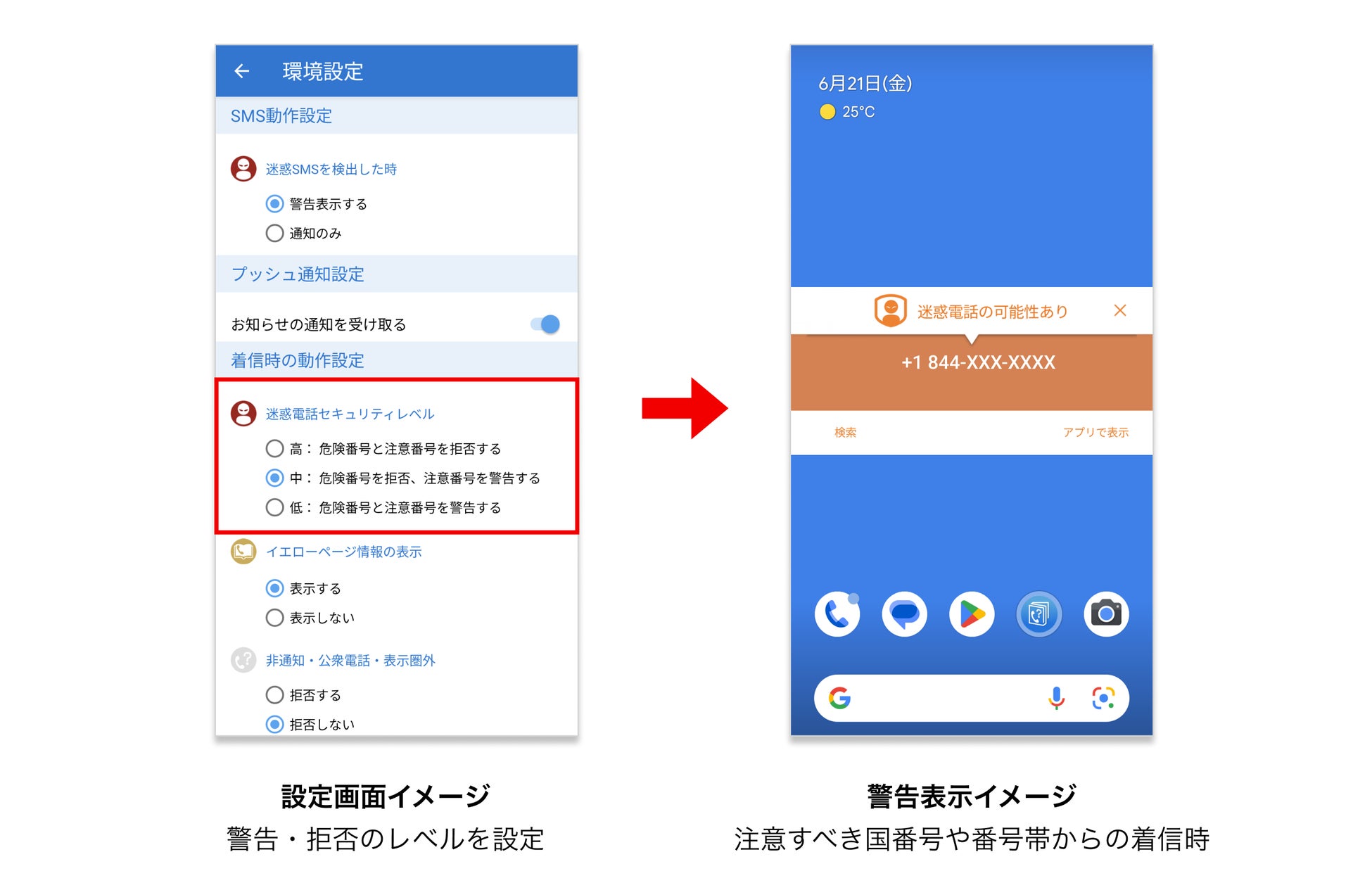 新機能では、迷惑な可能性のある電話の発着信を、特定の国番号や番号帯単位で検知し警告・拒否します。直近で多発している「+1」や「+800」など、迷惑疑いのある国際電話番号を検知することで、多発する特殊詐欺の対策にご活用いただけます。