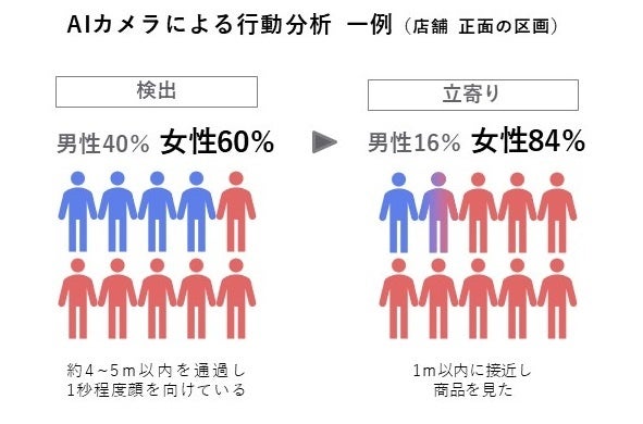 店舗内の行動分析(2024年8月1日~8月31日の1ヶ月)の結果、店舗正面の区画を例にあげますと、“検出”数(商品に1秒程度顔を向けた顧客)の性別割合は女性が60%であったが、“立寄り”数(1m以内に接近し商品を見た)の割合は女性が84%となり、正面の区画に陳列していた商品の女性ニーズが高いと考えられます。一方で、別のファッション小物を並べた区画では、30代や40代の男性の立寄り数が半数以上を占めるなど、立寄り数の割合から性別によるニーズを的確に把握することが可能です。