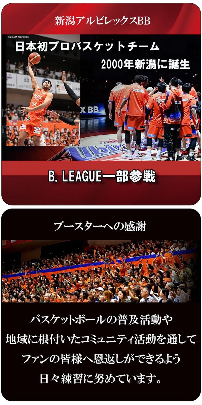 新潟アルビレックスBBはチームを応援してくれる方々を日頃の多大なサポートへの感謝の意味を込めブースターと呼んでいます。新潟アルビレックスBBはブースターの皆様によって支えられ、ブースターの皆様へ夢と感動を提供しています。