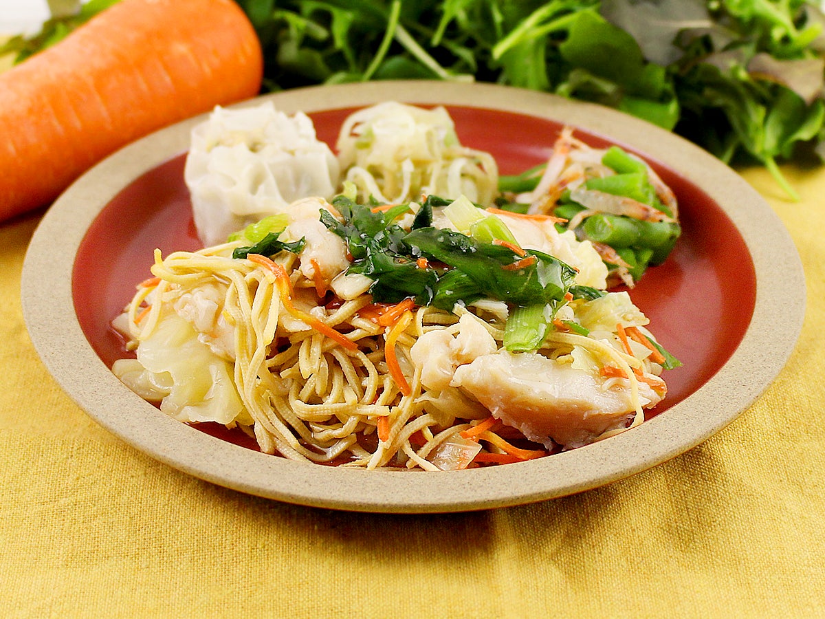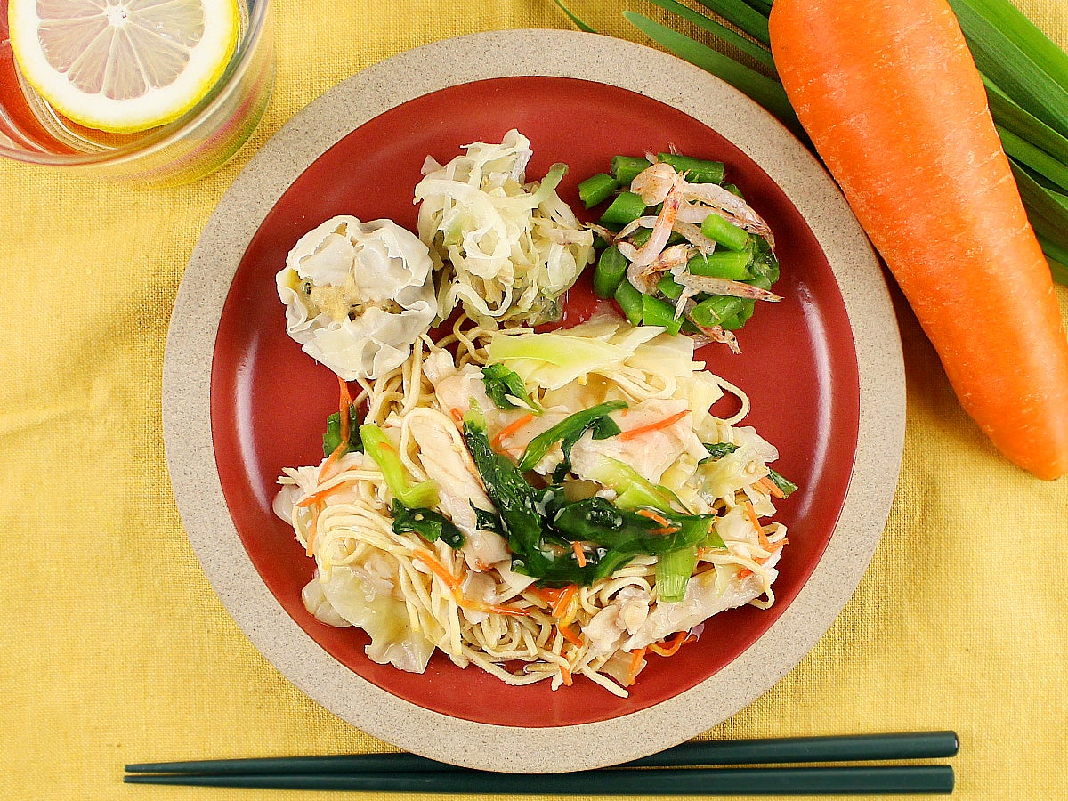 豆腐干と蒸し鶏、4種類の野菜(キャベツ、人参、ニラ、もやし)を塩味の鶏ガラだしで仕上げたさっぱりとお召し上がりいただけるメニューです。豆腐干は中国や台湾で一般的に使われており、豆腐を圧縮して脱水し、乾燥させ、麺状に切った食材です。噛むほどに感じる大豆の香りと独特の食感をお楽しみいただけます。今回は細切りの豆腐干を使用しております。副菜は高菜焼売、うま塩ザーサイ、インゲンと桜エビのあえものです。