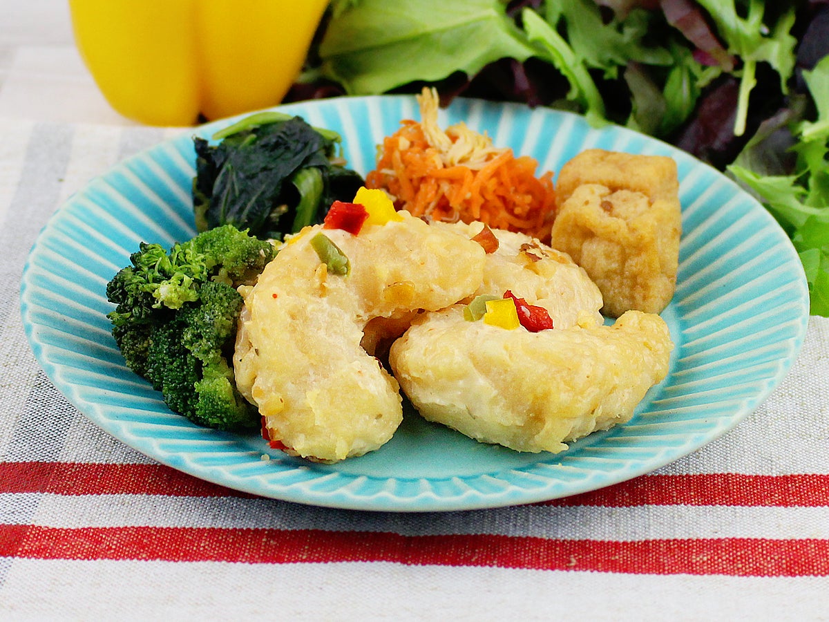 梅ソースと大葉を包んだ鶏むね肉を竜田揚げにしました。爽やかな酸味と香りが鶏竜田揚げとの相性抜群です。横に添える温野菜はブロッコリー、人参、赤しそを合わせた山芋です。