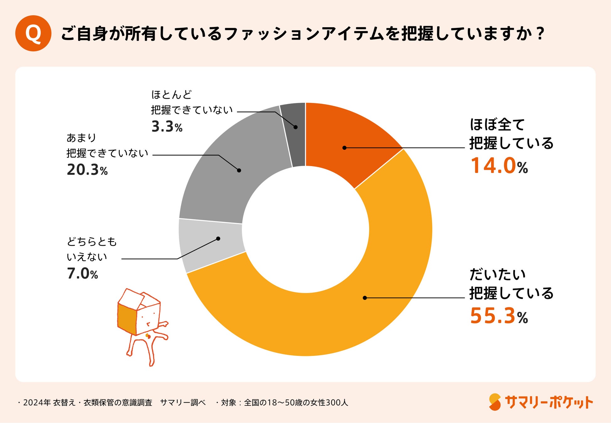 「ご自身が所有しているファッションアイテムを把握していますか?」と尋ねると、回答者の約7割が自分の所持しているファッションアイテムを把握していると回答。把握できていないと回答したのは4人に1人にとどまりました。
