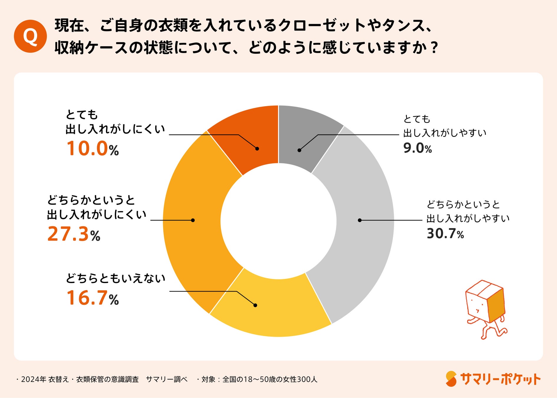 また「現在のご自身の衣類を入れているクローゼットやタンス、収納ケースの出し入れのしやすさ」について尋ねると3人に1人は「出し入れがしにくい」と回答。さらに、「どちらともいえない」を含めると、半数以上(54.0%)がクローゼットの状態に満足していない様子が伺えます。