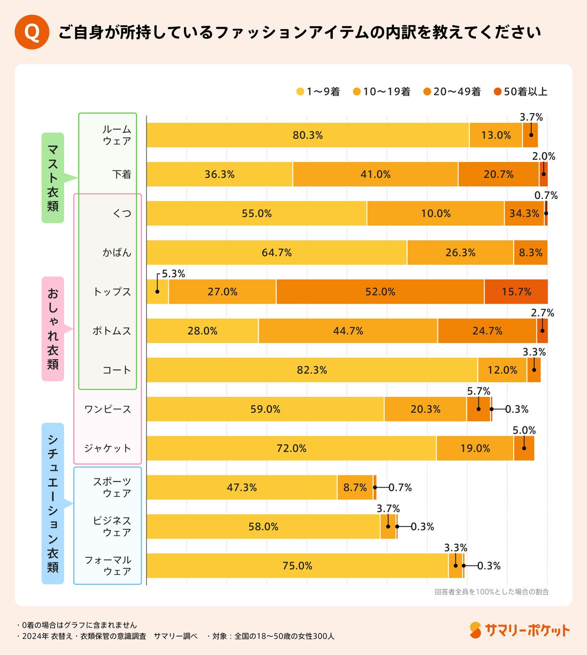 マスト衣類とおしゃれ衣類のどちらにも分類されるトップスは半数以上が20〜49着、ボトムスは約7割が10点以上所有していると回答しています。