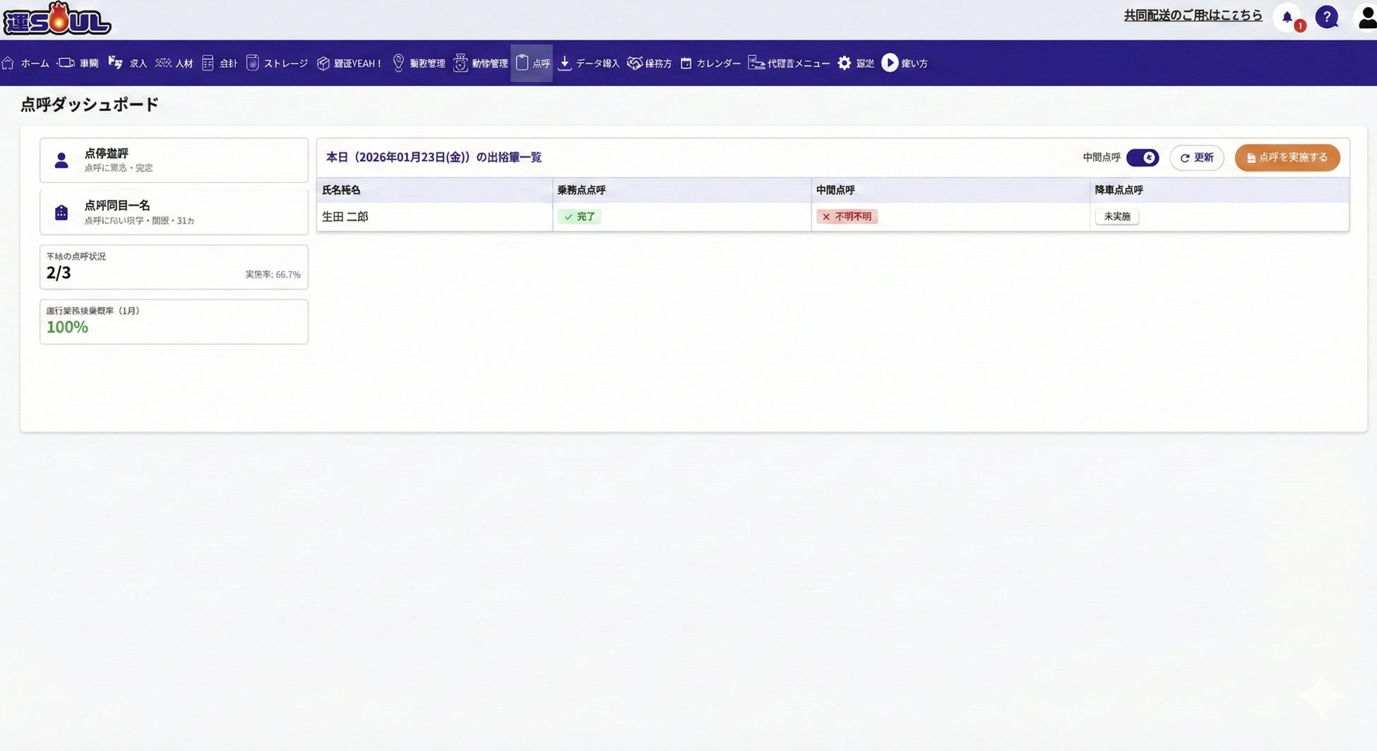 当日の出勤登録が行われている場合のみ点呼登録が表示されるため、実運用に即した形での管理が行えます。