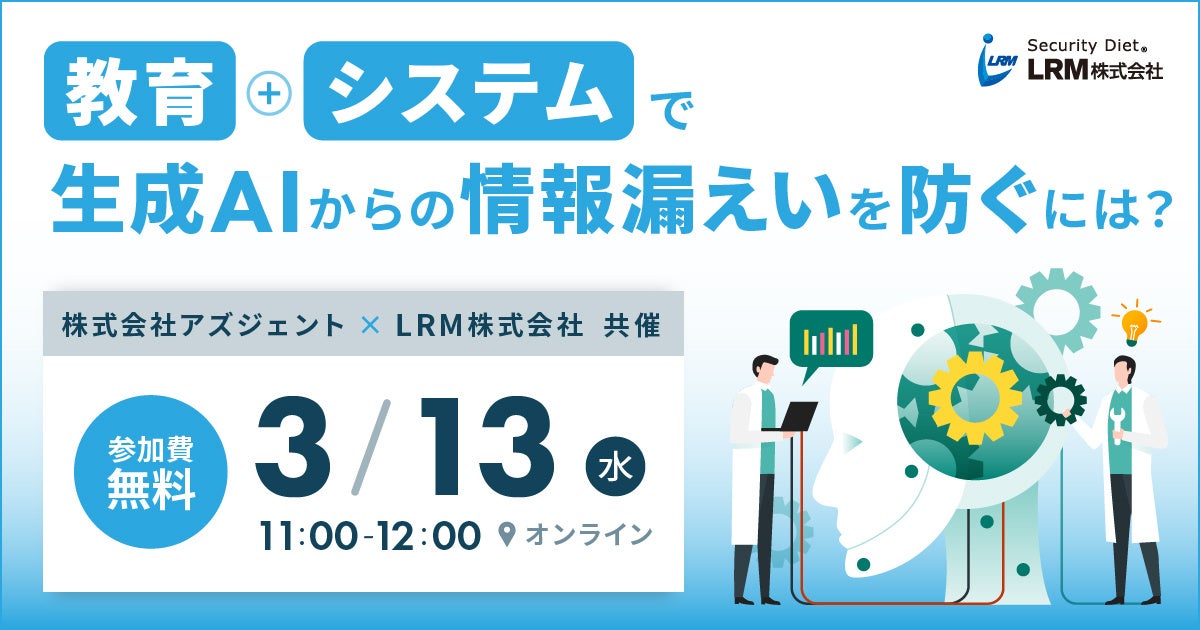 LRM株式会社(本社:兵庫県神戸市、代表取締役CEO:幸松哲也)と、株式会社アズジェント(本社:東京都中央区、代表取締役:杉本隆洋)は、2024年3月13日(水) 11時から、教育とシステムで生成AIからの情報漏えい対策に関するセミナーを無料開催します。Zoomでお気軽にご視聴いただけますので、ぜひご参加ください。