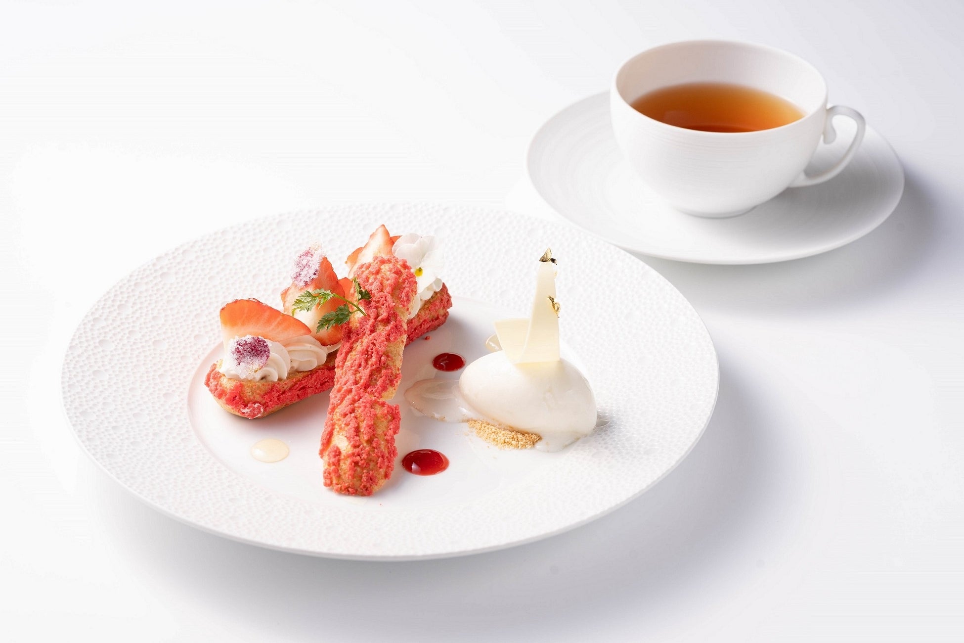 「いちごさん」のつややかな紅色をイメージした真っ赤なエクレア生地の中に、クレーム・ディプロマット(カスタードクリームと生クリームを混ぜたもの)、その上にカカオ香るクリームを重ね、ホワイトバルサミコ酢をきかせた「いちごさん」のソテーを飾りました。濃厚なエクレアに、ホワイトバルサミコ酢のさわやかな酸味を感じる「いちごさん」とヨーグルトソルベを添え、さっぱりと軽やかな一皿に仕上げました。